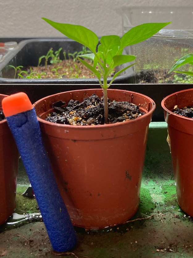 Last year’s chilli was a disaster – one stumpy chilli half an inch long. I blame the lack of sun. The seedlings look great. As they do this year…. I germinated them all in the growlight. Then I moved 3 of them upstairs and left 2 in the growlight – you can tell which…