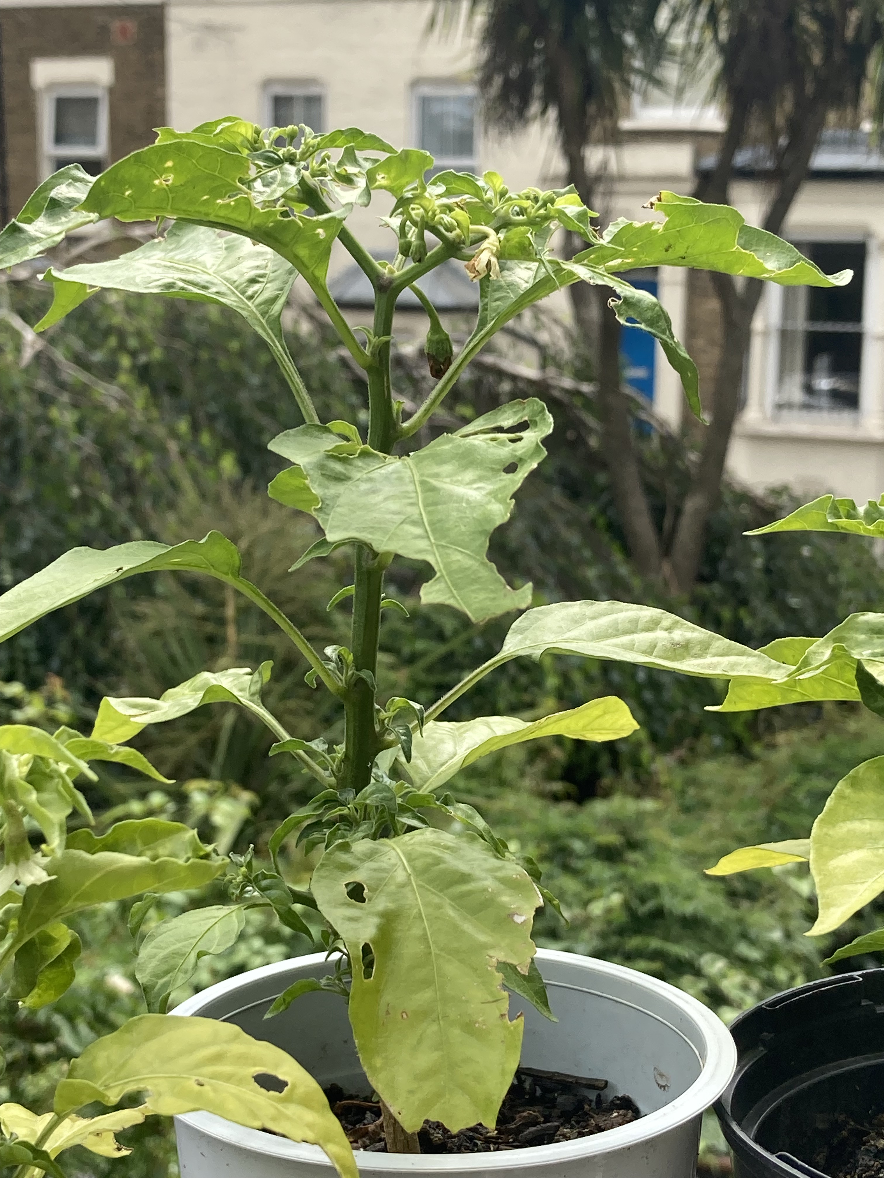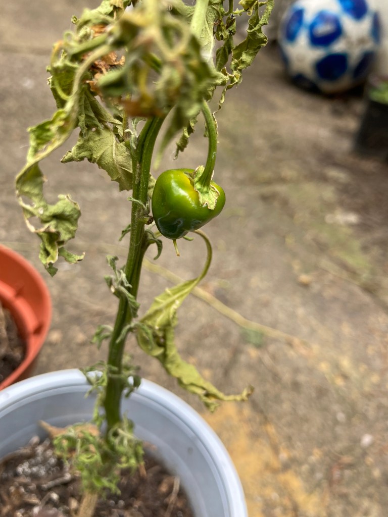 I don’t think it’s going to end well. I put them in the greenhouse and then hardened them off. When we had some sun in the Spring, I moved them round the garden so they got as much sun as possible. But it has been a terrible summer. Every time there has been a ray of sunshine, they’ve tried to flower but the rain comes in and strips them off. They’ve gone weirdly bushy, and as they haven’t set any fruit, I can’t see them growing any chillis. Maybe next year…