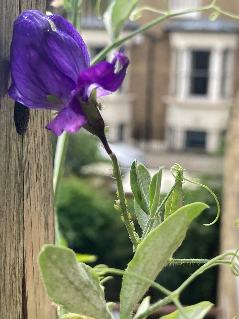 Sweet peas: they are spindly & stunted! They have tiny stems. And loads of plump green aphids. And mildew! As predicted in I love Sweet peas and Sweetpeas don’t love me!