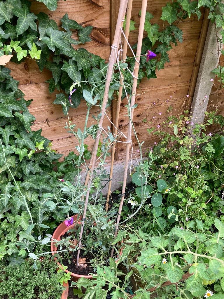 I have finally pulled up the poles I put in the back bed as there are no sweet peas growing up there. I am going to give up cutting the ones in pots (too short-stemmed to put in vases) and let them go to seed – if there is any point in having mildew-prone, short stemmed seeds….