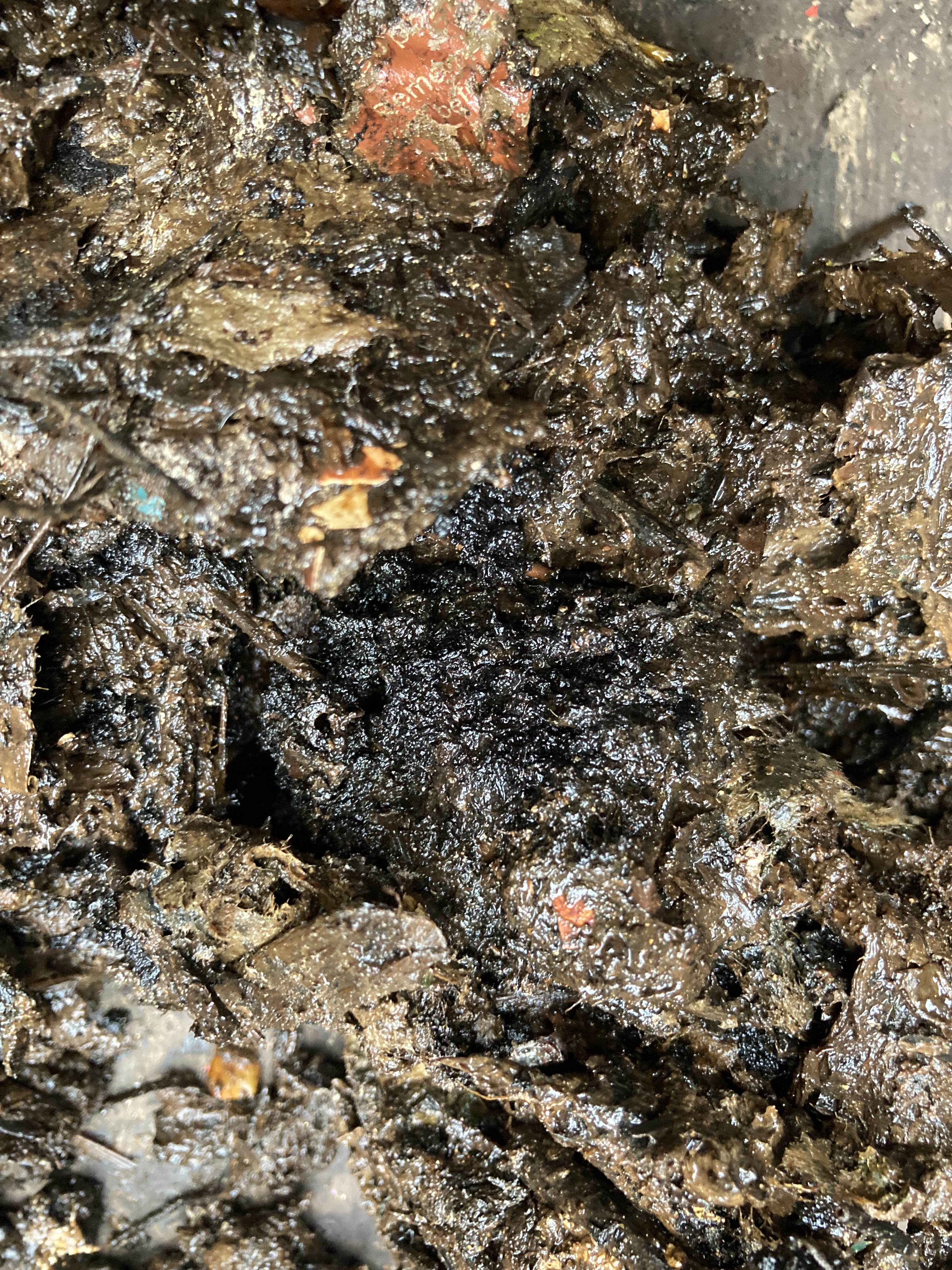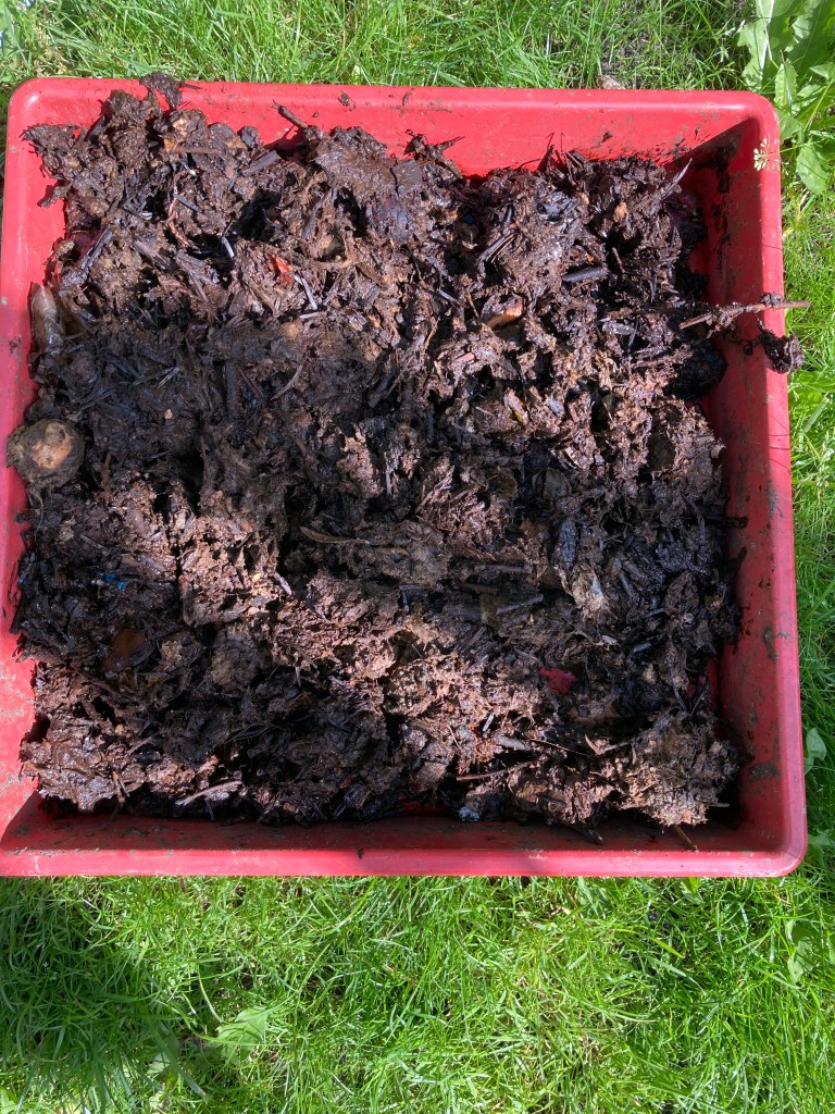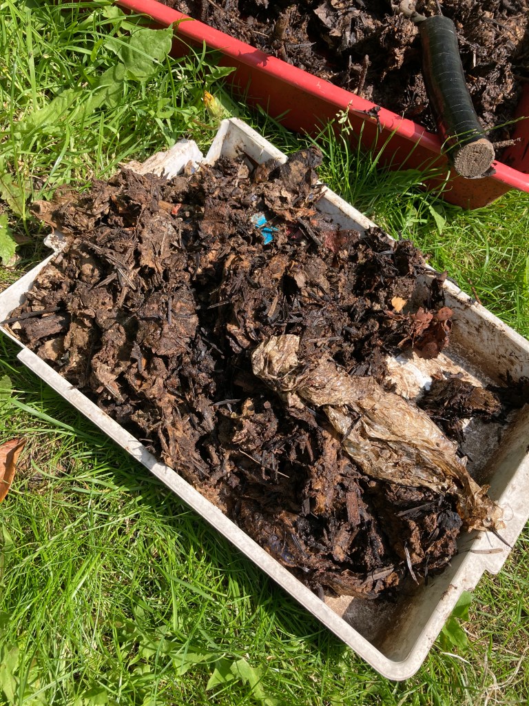 I bought it just as lockdown started (so nearly a year?) (and then persuaded Andrew to buy his). I still haven’t got good compost out of it. I got some nearly good stuff a couple of months ago and put the best on the garden as a mulch and the worst back in the bin. This month, I couldn’t bear it any more so I took the smelly disgusting stuff out of the bottom. HB told me to aerate it – the smell is because it is anaerobically composting and I dried it as best I could and this is what it looks like….