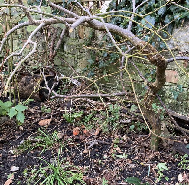 Turning things from a mess to a garden seems mostly to involve cutting stuff right back, tidying stuff up & killing things. I’ve started in this photo, and also cut the edge of the lawn with shears (I will mow the middle). I like the right-hand side more than the left because it’s still wilder….